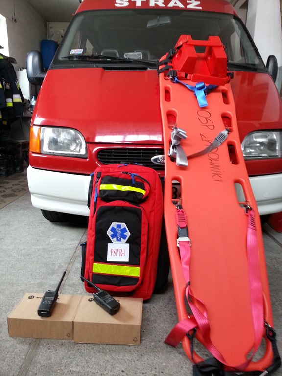 Miło nam poinformować, że w ostatnim czasie nasza jednostka wzbogaciła się o kilka elementów wyposażenia, m. in. torbę medyczną z wyposażeniem, dwa radiotelefony przenośne oraz deskę ortopedyczną. Środki finansowe na zakup sprzętu udało się pozyskać z Fundacji PZU,