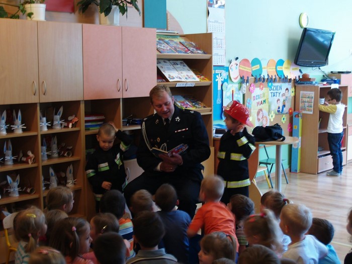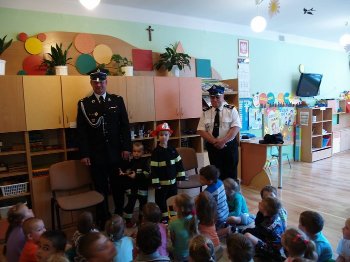 Druhowie Zbyszek i Jerzy wsparci najmłodszymi członkami OSP Wojtusiem i Weroniką złożyli wizytę maluchom w Publicznym Przedszkolu nr 1 w Jadownikach. Strażacy opowiedzieli o swojej pracy a także zaproponowali dzieciom wstąpienie w szeregi Dziecięcej Drużyny Pożarniczej, której utworzenie jest planowane przy naszej OSP. Jej powołanie jest bardzo ciekawym rozwiązaniem dla najmłodszych sympatyków pożarnictwa, bowiem Dziecięca Drużyna Pożarnicza w swych szeregach skupia dzieci w wieku od 4 lat. Wszystko z inicjatywy Z-cy Naczelnika OSP Dh. Zbigniewa Serwatki, który na co dzień opiekuję się Młodzieżową Drużyną Pożarniczą. Kolejnym punktem strażackiej wizyty było czytanie bajek o tematyce strażackiej. Nie mogło zabraknąć także wspólnego pamiątkowego zdjęcia.